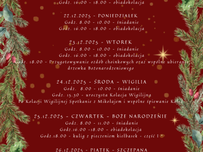 - W okresie Świątecznym 21.12.2025 – 27.12.2025 rezerwacje przyjmowane są na minimum 4 noclegi. Cena pobytu obejmuje nocleg, śniadanie, obiadokolację, Kolację Wigilijną oraz wszytkie dodatkowe atrakcje.